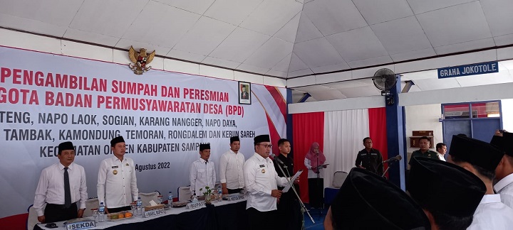 SURABAYAPI.COM, Sampang - Untuk mengoptimalkan roda pemerintahan Desa, Bupati Sampang H Slamet Junaidi turun gunung melantik dan pengambilan sumpah Badan Permusyawaratan Desa (BPD) di wilayah kecamatan Omben, sebanyak 11 Desa. Pelantikan tersebut dilaksanakan di pendopo kecamatan Omben, Rabu (30/8/2022).