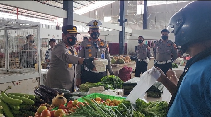 Sambil disertai penuh humor dan humanis Kapolres Blitar Kota langsung membeli cabe, dan yang lainnya untuk dibungkus lalu dibagikan kepada masyarakat, selain beras dan minyak kelapa.