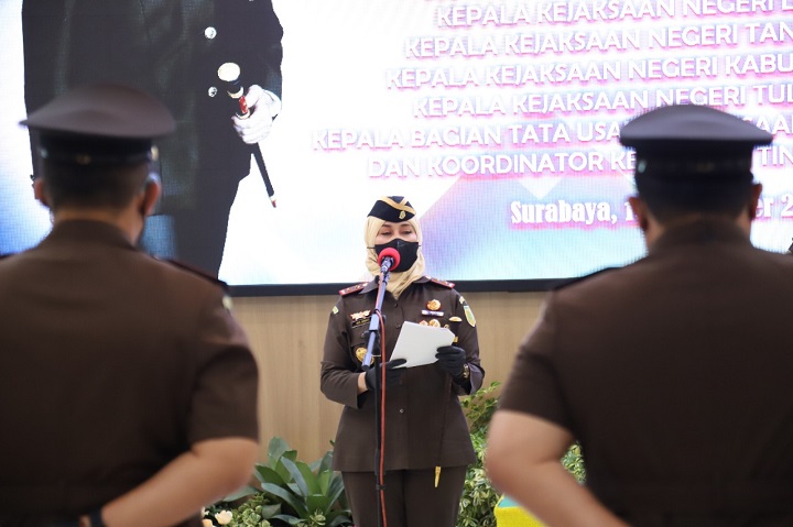 Serah terima jabatan (Sertijab) yang digelar di lantai 8 Gedung Kejati Jatim, Kamis (15/9) ini dipimpin langsung oleh Kepala Kejaksaan Tinggi (Kajati) Jatim, Mia Amiati. Mia berpesan kepada Kajari yang baru, selain meningkatkan prestasi juga tetap berkoordinasi dengan Pemda setempat.