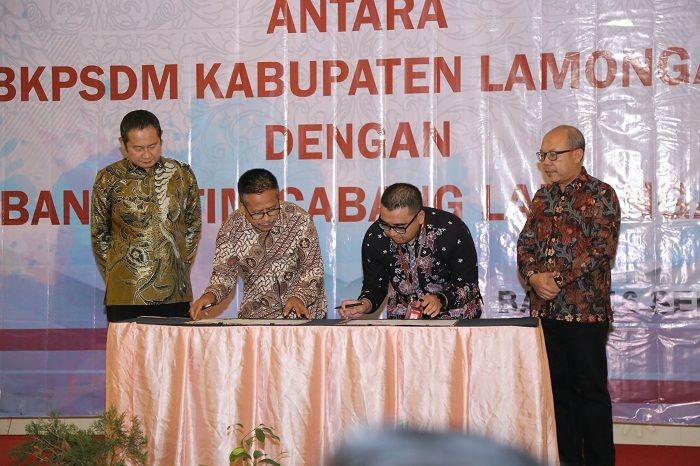 SurabayaPagi, Surabaya - PT Bank Pembangunan Daerah Jawa Timur Tbk (bankjatim) melakukan penandatanganan Perjanjian Kerjasama (PKS) dengan Badan Kepegawaian dan Pengembangan Sumber Daya Manusia (BKPSDM) Lamongan. PKS ini dilakukan dalam rangka mengintegrasikan data Aparatur Sipil Negara (ASN) Kabupaten Lamongan melalui aplikasi Sistem Informasi dan Manajemen Kepegawaian Lamongan (SiMEGILAN) dengan aplikasi Kredit Multiguna Elektronik (e-KMG) bankjatim.