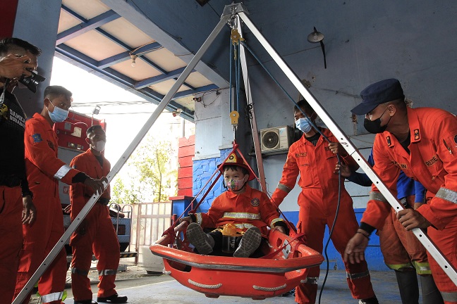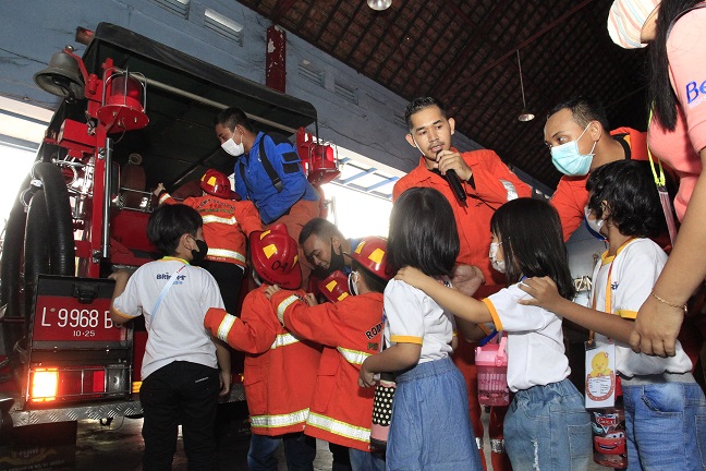 SURABAYAPAGI.COM, Surabaya - Petugas pemadam kebakaran (damkar) Pasar Turi Surabaya terlihat menerima kunjungan dari TK Bright Kiddie pada Rabu (21/9/2022).