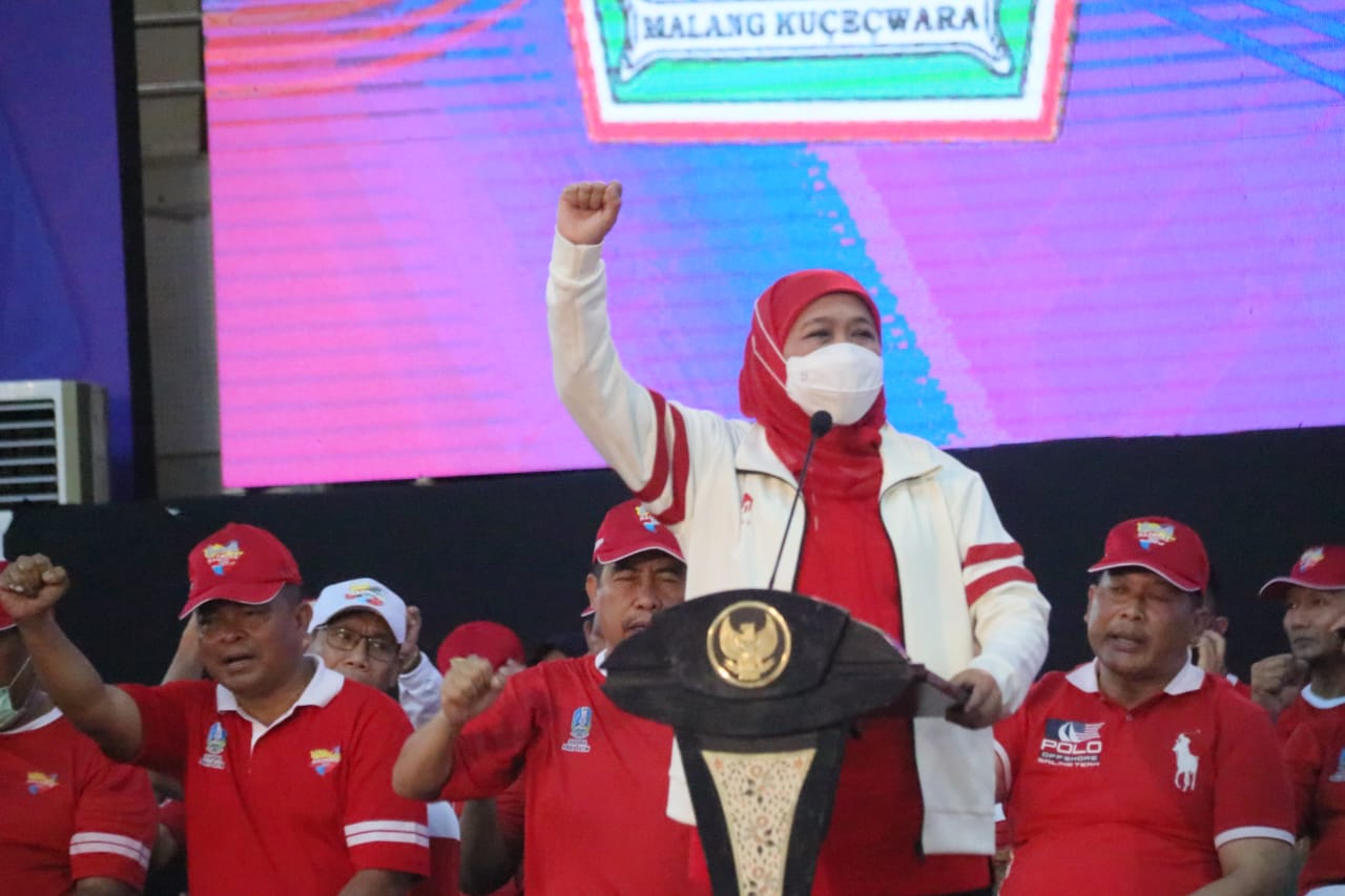 SURABAYAPAGI.com, Malang - Apel Puncak Hari Olahraga Nasional (Haornas) Provinsi Jawa Timur yang berlangsung di GOR Ken Arok, Kota Malang, Jumat (23/9/2022) berlangsung meriah. Dalam kesempatan itu, Gubernur Jawa Timur Khofifah Indar Parawansa pun hadir.