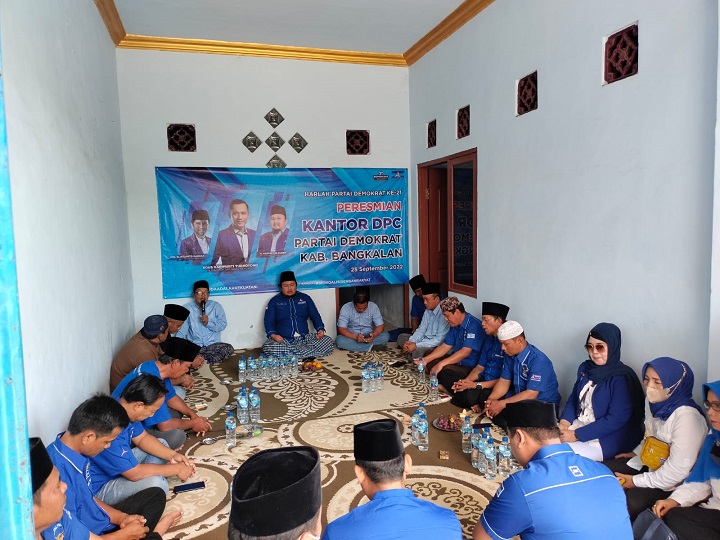 SURABAYAPAGI.COM, Bangkalan - Partai Demokrat Kabupaten Bangkalam siap menghadapi Pemilihan Umum (Pemilu) 2024 mendatang. Hal itu diungkapkan Ketua DPC Partai Demokrat Kabupaten Bangkalan Lora Hasani Bin Zubair saat menggelar tasyakuran kantor baru di jln RE Martadinata kelurahan Mlajah.