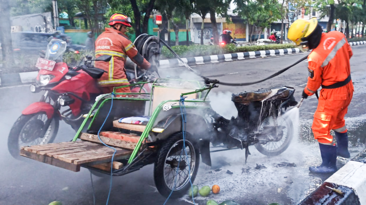 Berdasarkan informasi yang dihimpun, bentor yang bernopol W 3587 FX milik Suwandi itu terbakar usai mengantar penumpangnya ke pasar sambil mengangkut barang belanjaan.