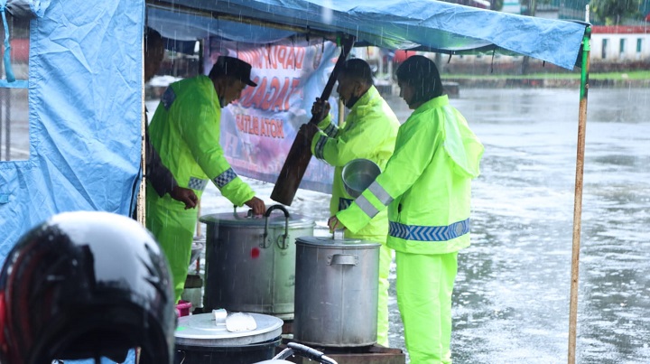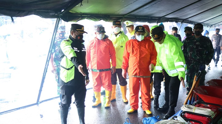 Setelah menggelar pasukan, Wali kota, Kapolres Blitar Kota dan beberapa pejabat termasuk team Tagana dan BPBD menyaksikan kesiapan para petugas di tenda tenda tempat peralatan persiapan tanggap darurat bencana, tak ketinggalan persiapan tempat masak, yang saat itu petugas memasak makanan yang akan dikirim ke wilayah bencana banjir di wilayah Kabupaten Blitar.
