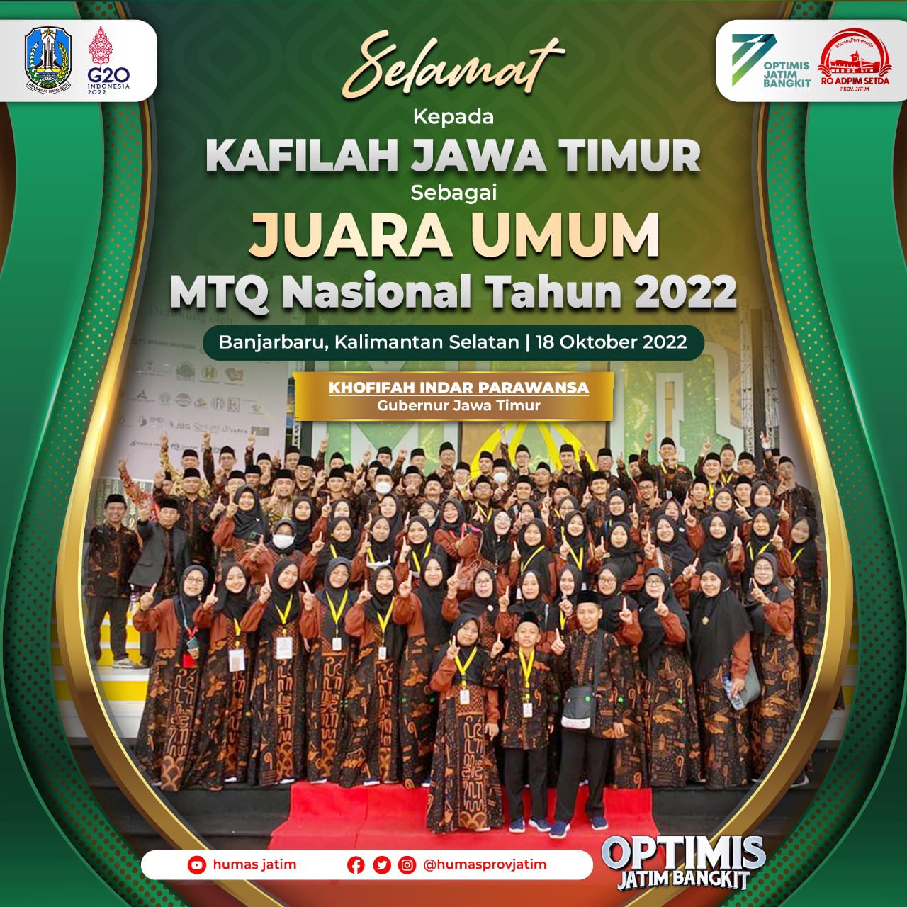 “Alhamdulillah, alhamdulillah, alhamdulillah. Kafilah MTQ Nasional Jatim di Banjarmasin Juara Umum. Terima kasih atas kerja keras seluruh kafilah, pelatih dan tim ofisial. Ini adalah kado terindah bagi HUT Pemprov Jatim ke-77. Terima kasih banyak semuanya,” ungkap Gubernur Khofifah di Gedung Negara Grahadi Surabaya, Selasa (18/10) malam.
