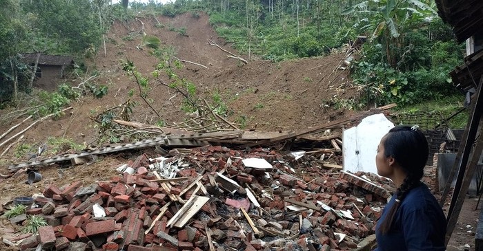 Material longsor menghancurkan empat rumah. Dua rumah hilang di terjang tanah.