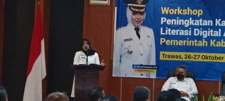 SURABAYAPAGI.COM, Mojokerto - Bupati Mojokerto, Ikfina Fahmawati membuka kegiatan workshop peningkatan kapasitas literasi digital Aparatur Sipil Negara (ASN) lingkup Pemkab Mojokerto di Hotel Arayanna, Kecamatan Trawas, Kabupaten Mojokerto, Rabu (26/10) sore.