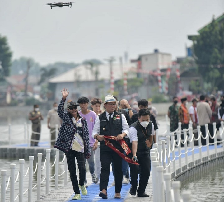 Dengan gaya khasnya mengenakan blazer dan topi, Bonge berjalan sambil melambaikan tangan kepada warga yang menyaksikan peresmian tuntasnya revitalisasi situ senilai Rp20 miliar tersebut. Ridwan Kamil pun terlihat tak kalah gaya dengan pembawaan model viral tersebut.