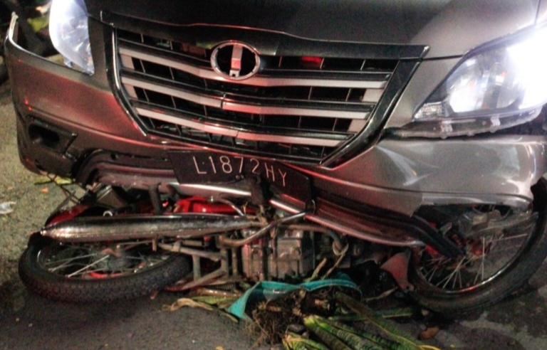 Akibat peristiwa ini Innova sampai naik di trotoar jalan, sementara sepeda motor masuk ke kolong mobil. Korban langsung dibawa ke Rumah Sakit Suwandi Surabaya. Hingga berita ini diunggah, belum jelas kronologi kejadian ini.ari