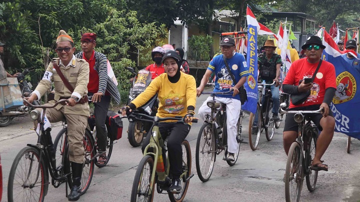 SURABAYAPAGI.COM, Mojokerto - Bupati Mojokerto, Ikfina Fahmawati berkesempatan ngontel bareng pada momen memperingati HUT Komunitas Sepeda Tua Indonesia (KOSTI) Mojokerto Raya yang ke-13, Minggu (13/11) pagi. Bersama ratusan onthelis, Bupati Ikfina berangkat dari Desa Mlaten, Kecamatan Puri hingga finish di Desa Mojosulur, Kecamatan Mojosari.