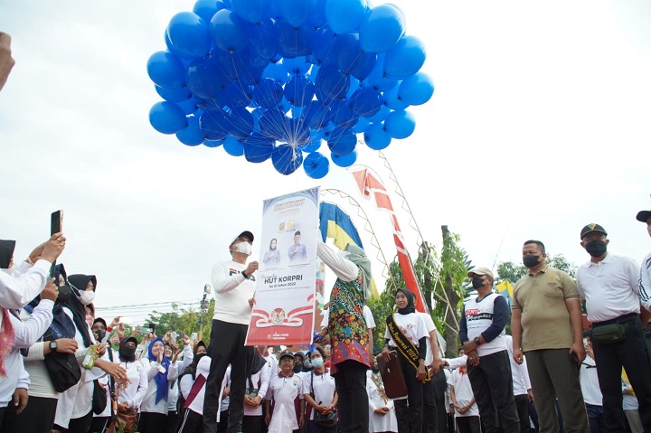 SURABAYAPAGI.COM, Mojokerto - Sejumlah kegiatan digelar Pemerintah Kota Mojokerto dalam peringatan HUT ke-51 Korps Pegawai Republik Indonesia (KORPRI) tahun 2022. Salah satunya "Mlaku Bareng Ning Ita, Blonjo Pasar Murah", Jumat (18/11).