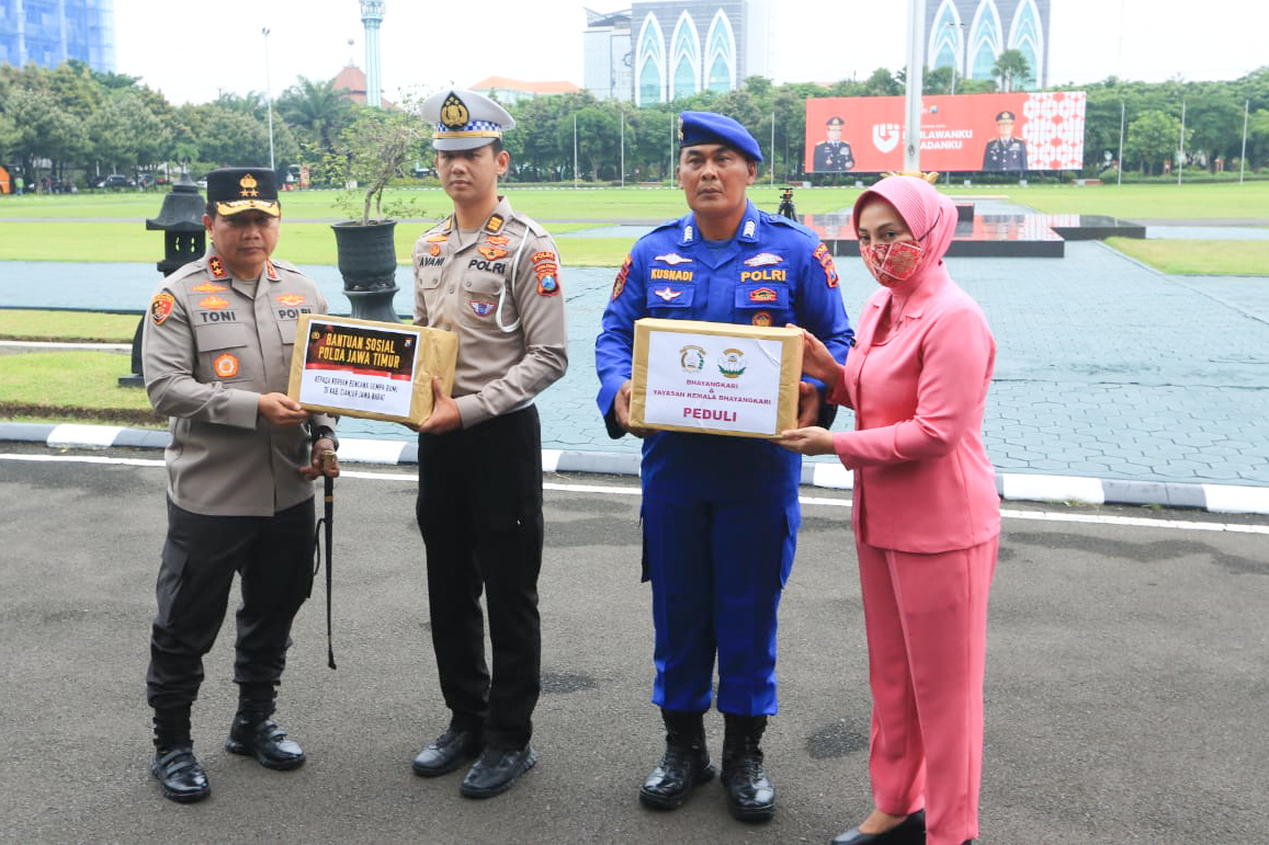 SURABAYAPAGI.COM, Surabaya - Polda Jawa Timur dan Kemala Bhayangkari memberangkatkan bantuan sosial (bansos) sebanyak 10.570 sembako untuk korban bencana di Cianjur, Jawa Barat Rabu (23/11/2022) pagi. Pemberangkatan sembako dilaksanakan di depan Lobby Tribrata, Mapolda Jatim Surabaya.