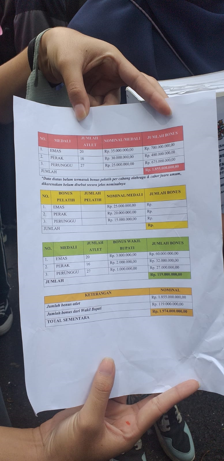 Dalam audiensi itu Wabup Rahmat Santoso mengatakan kalau dirinya tidak pernah berjanji mengenai bonus untuk atlet porprov dari APBD, tapi akan memberikan bonus dari uang pribadi untuk peraih emas Rp 3 juta, perak Rp 2 juta dan perunggu Rp 1 juta.