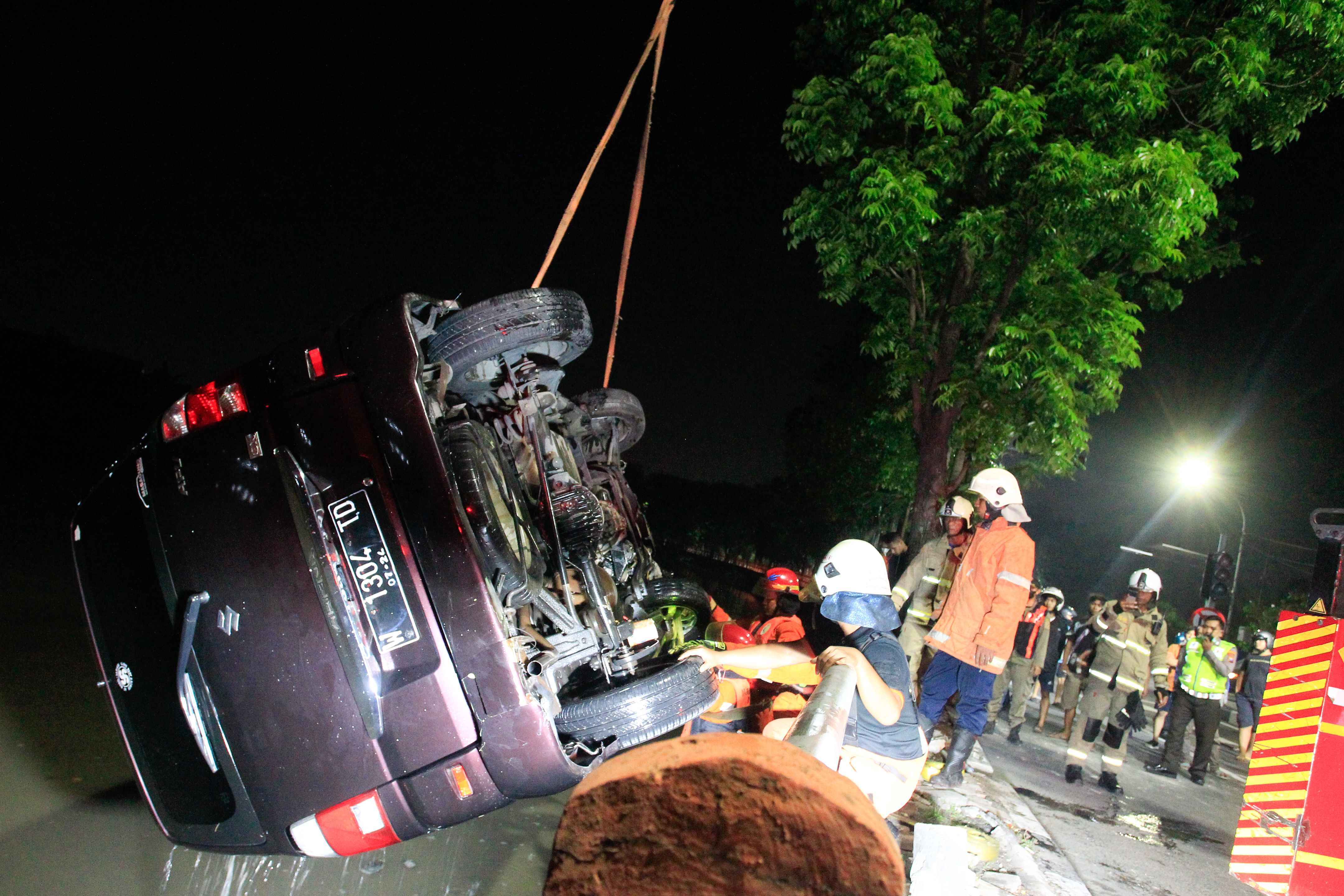 SURABAYAPAGI.COM, Surabaya - Para warga dan pengguna jalan Gunungsari dihebohkan dengan sebuah mobil Suzuki APV berplat nomor W 1304 TD yang tiba-tiba tercebur ke Kali Rolak, Sabtu (26/11/2022).