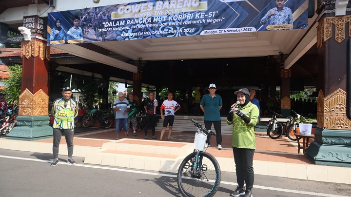 SURABAYAPAGI.COM, Mojokerto - Bupati Mojokerto, Ikfina Fahmawati menghadiri agenda gowes bareng dalam rangka rangkaian peringatan HUT Korpri ke-51, Minggu (27/11) pagi. Dalam kesempatan ini, Bupati Ikfina berharap ASN Kabupaten Mojokerto bisa meluangkan waktu untuk berolahraga sambil mempererat silaturahmi.