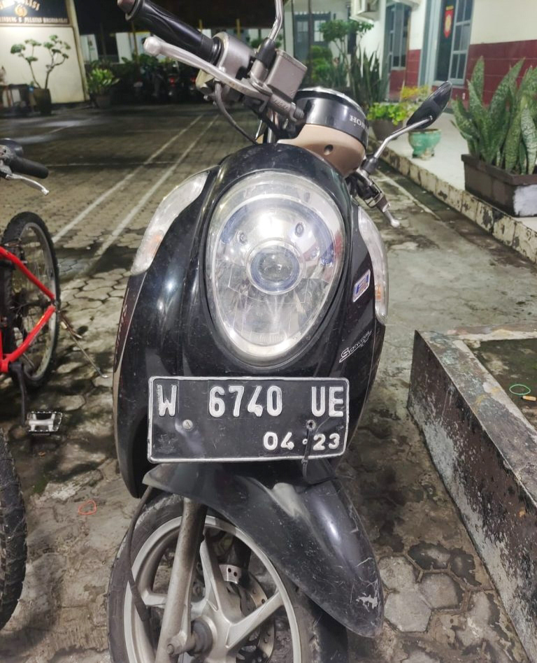 Dalam penangkapan itu, polisi berhasil mengamankan barang bukti berupa 1 (satu) unit sepeda motor Honda Scoopy warna Hitam Nopol W 6740 UE, 1 (satu) lembar STNK asli dan 1 (satu) buah kunci kontak. ari