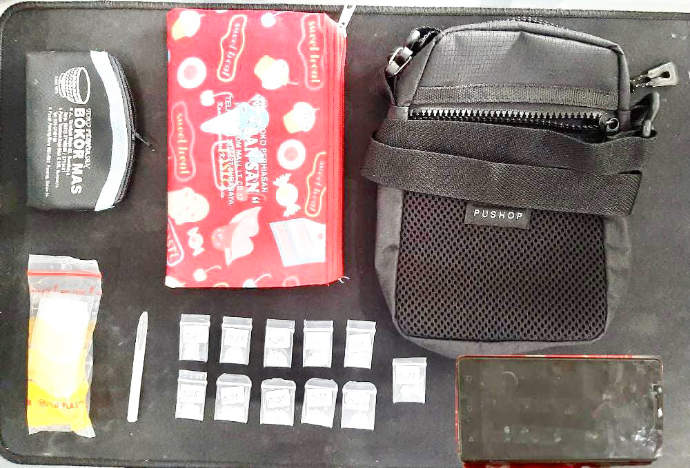 Belasan barang bukti narkoba 2,48 gram kemudian diamankan petugas. Selain sabu polisi juga menyita satu dompet kecil warna hitam, satu dompet besar warna merah, satu buah sekrup sedotan plastik, satu pak plastik klip, satu buah tas warna hitam dan satu buah HP.