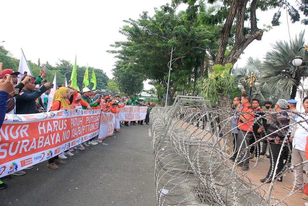SURABAYAPAGI.COM, Surabaya - Ratusan buruh Jawa Timur (Jatim) melakukan aksi demonstrasi di Kantor Gubernur Jawa Timur, Jalan Pahlawan, Surabaya, Rabu (7/12/2022). Massa demo itu tergabung dalam Federasi Serikat Pekerja Metal Indonesia (FSPMI), Konfederasi Serikat Pekerja Indonesia (KSPI) dan Partai Buruh.