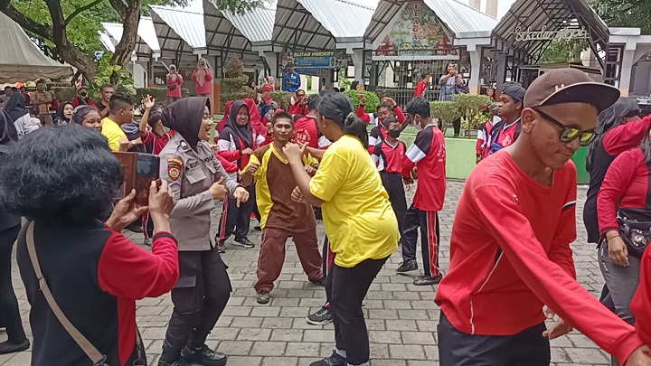 Dengan mengenakan seragam olahraga para murid tampak antusias ikuti irama joget bareng tak luput para orang tuanya, sementara pihak keamanan dari Polsek Kanigoro juga ikut serta menyemangati anak anak berusia 10 tahunan itu dengan joget bersama, bahkan ada yang minta gendong petugas untuk dipanggul.