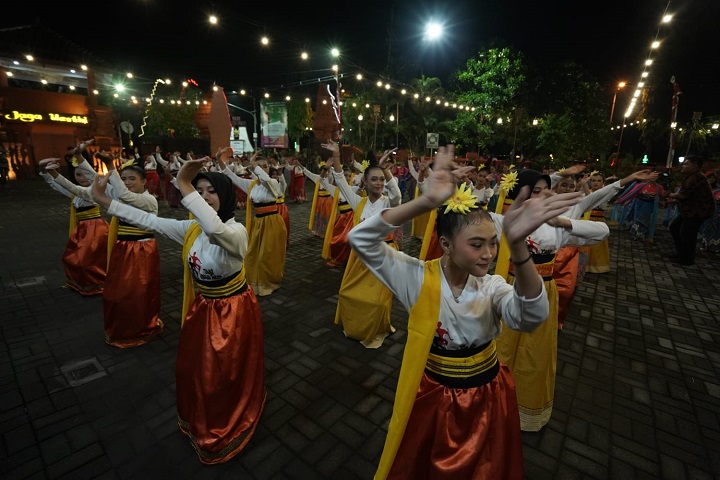 SURABAYAPAGI.COM, Mojokerto - Setidaknya 100 siswi SMP se-Kota Mojokerto menunjukkan kebolehannya menarikan tari Sekar Mojo di halaman Rumah Rakyat Kota Mojokerto, Kamis (16/12) malam.