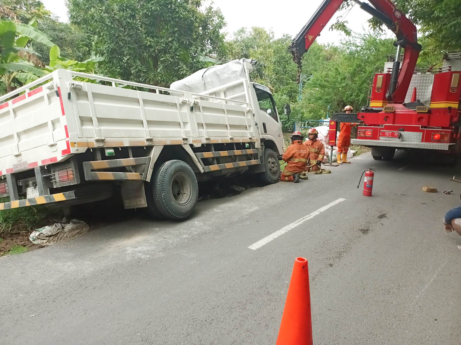Dinas Pemadam Kebakaran dan Penyelamatan (DPKP) Kota Surabaya mengirimkan 1 Unit tim rescue untuk mengevakuasi truk tersebut dengan terlebih dahulu menurunkan semen agar memudahkan proses evakuasi.