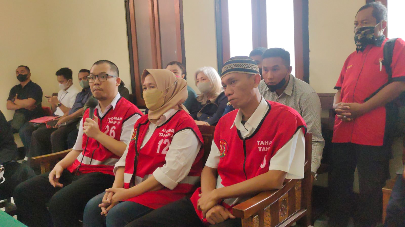 SURABAYAPAGI.COM, Surabaya - Terry Imanuel bersama Tri Tulistiyani dan Joko Rianto, tiga terdakwa kasus dugaan pengeroyokan Lauw Shirley Andayani di showroom Manna Mobil menjalani sidang pemeriksaan terdakwa di Pengadilan Negeri (PN) Surabaya, Rabu (21/12/2022).