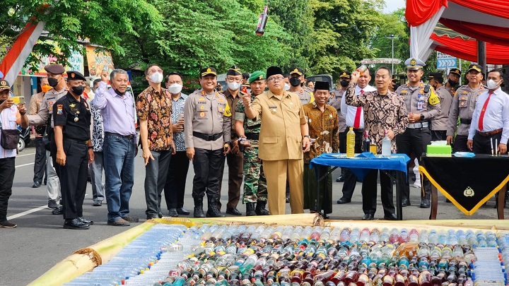 Selanjutnya setelah gelar Pasukan Kapolres Blitar Kota dan Forkopimda Kota Blitar dan seluruh undangan menyaksikan pemusnahan ribuan botol miras (2625) dengan secara simbolis wali kota dan jajaran Forpimda melempar botol miras yang akan digilas dengan sepur tumbuk, di lanjut pemotongan knalpot motor brong. Les