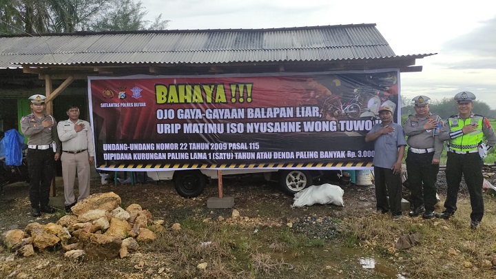 "Sesuai petunjuk dan arahan Bapak Kapolres, guna memberikan rasa aman dan tertibnya berlalu lintas sekaligus jelang Tahun 2023 , kami dari Satlantas Polres Blitar menghimbau dan mempertegas larangan balap liar kepada siapapun pengguna jalan raya, khususnya di wilayah Blitar Selatan, karena jalan raya bukan untuk ajang balap liar, sekaligus demi keselamatan bersama dalam berlalu lintas, dan mematuhi rambu rambu lalu lintas, hal itu sesuai dengan UU No 2 tentang Kepolisian RI," terang Ipda Putut se ijin Kapolres Blitar AKBP Adhitya Panji Anom S.IK.