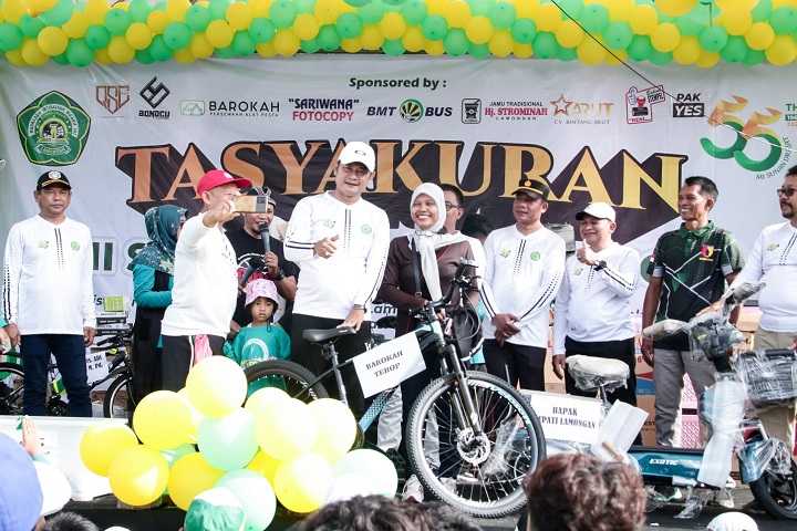 SURABAYAPAGI.COM, Lamongan - Dalam rangka tasyakuran Hari Ulang Tahun ke 55 setengah abad lebih, MI Ma'arif NU Sunan Drajat Lamongan, Minggu (29/1), menggelar jalan sehat dan diberangkatkan oleh bupati yang dihadiri juga ketua DPRD setempat.