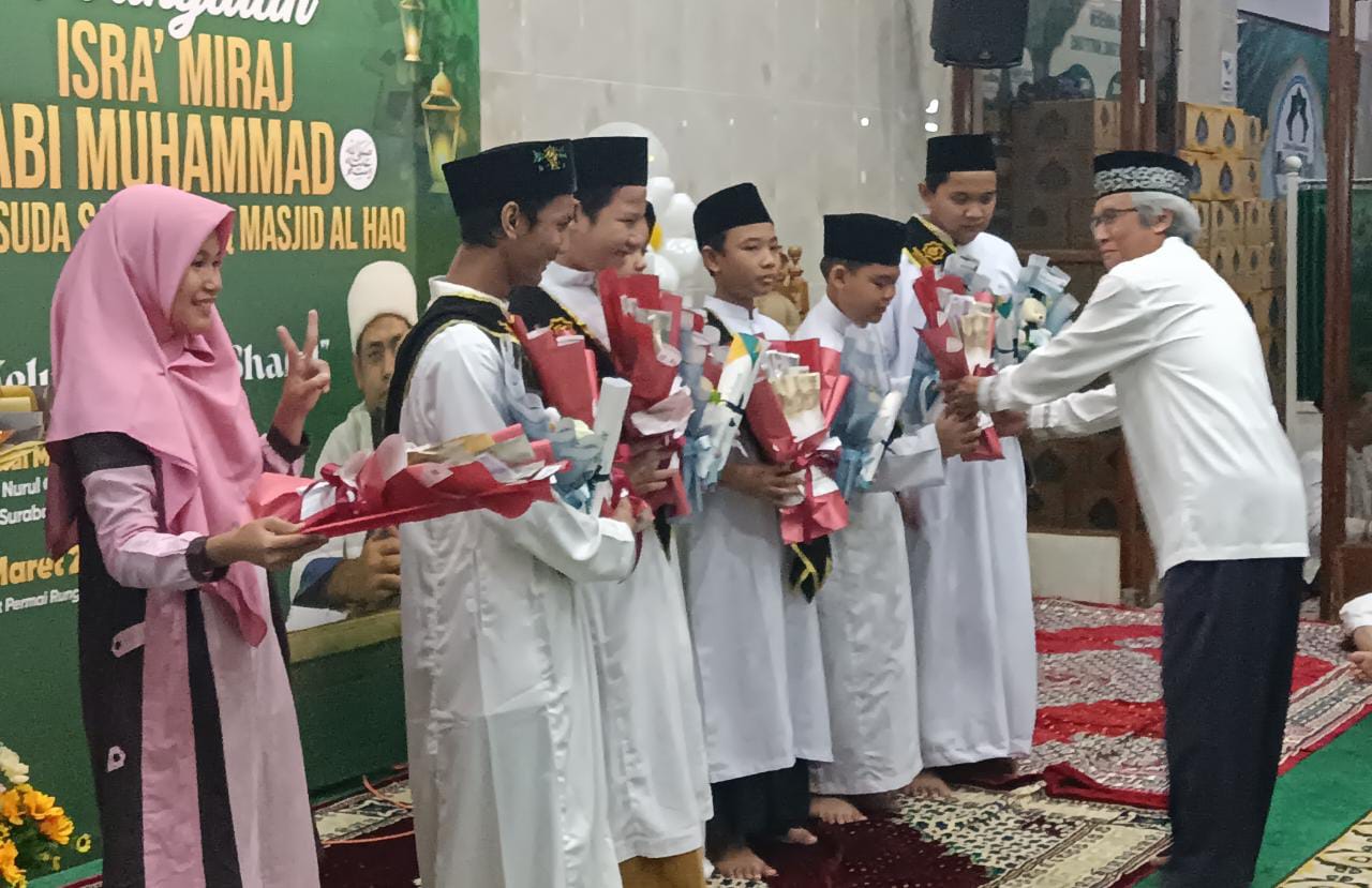 SurabayaPagi, Surabaya - Peringati Hari Besar Islam Isra Mi'raj dan Wisuda Santri Taman Pendidikan Quran (TPQ) Al Haq, Bidang Dakwah Dewan Kemakmuran Masjid (DKM) Al Haq Rungkut Mapan Permai Rungkut Mapan Barat (RMB) Surabaya menggelar tauziah bertema "Kita, Keluarga dan Shalat" Sabtu (4/3/2023) malam.
