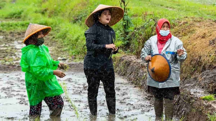 Cara menanam padi Puan Maharani seperti tak biasanya kita lihat dilakukan oleh petani.