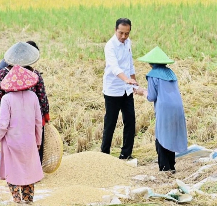 Jokowi, hanya berbincang sejenak sambil mengecek langsung kondisi padi yang dipanen saat itu.