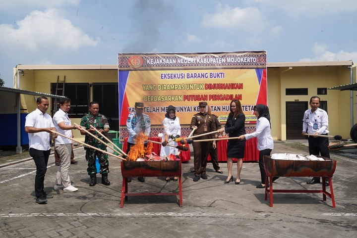 Pemusnahan sejumlah barang bukti yang telah memiliki kekuatan hukum tetap tersebut berlangsung di halaman Kantor Kejaksaan Negeri (Kejari) Kabupaten Mojokerto di Jalan RA Basoeni, Kecamatan Sooko, Kabupaten Mojokerto, Rabu (15/3) pagi.
