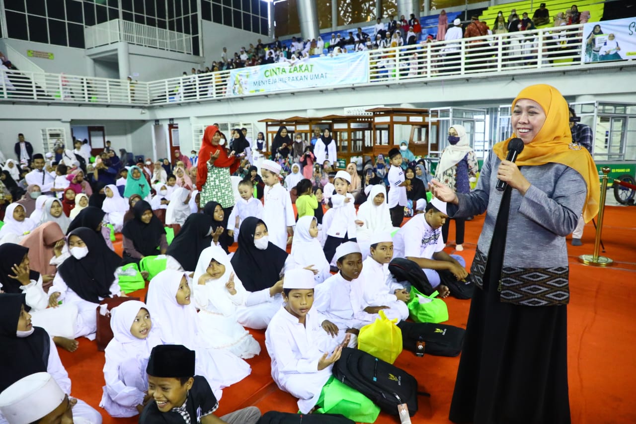 SURABAYAPAGI, Surabaya - Gubernur Jawa Timur Khofifah Indar Parawansa memulai rangkaian Safari Ramadhan 1444 Hijriah bersama Badan Amil Zakat Nasional (Baznas) Jatim dengan menyerahkan santunan untuk 1000 anak yatim piatu. Pemberian santunan itu dilakukan di Wahana Ekspresi Pusponegoro (WEP) Kab. Gresik pada hari Minggu (26/3) dengan tema Baznas Berbagi Ceria. Adapun santunan yang diberikan ialah uang senilai Rp 150.000 dan tas sekolah.