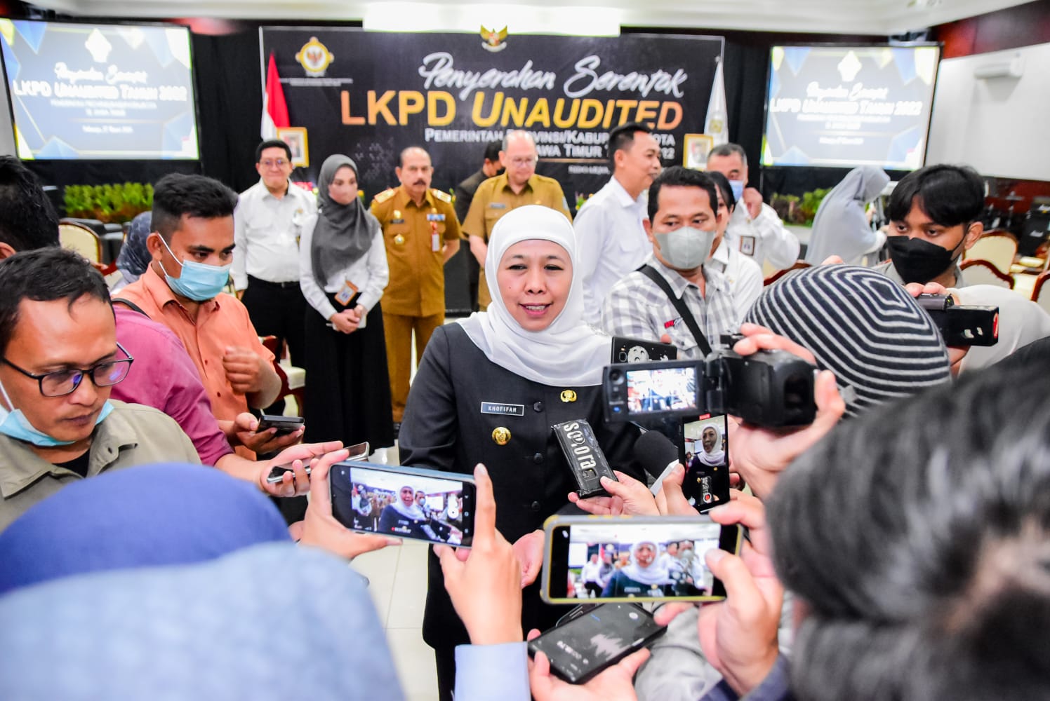 SURABAYAPAGI, Surabaya - Gubernur Jawa Timur Khofifah Indar Parawansa menyerahkan Laporan Keuangan Pemerintah Daerah (LKPD) Unaudited TA 2022 ke Badan Pemeriksa Keuangan (BPK) RI Perwakilan Jawa Timur. Dengan ini ia juga mendorong terwujudnya pelaporan yang akuntabel, transparan, valid serta tepat waktu. Kegiatan ini ia lakukan bersama bupati/walikota se Jawa Timur, Senin (27/3).