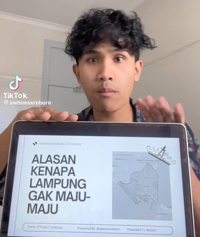 SURABAYAPAGI.com, Lampung - Pengguna akun Tiktok @awbimax dengan nama asli Bima Yudho Saputro tengah viral di media sosial lantaran unggahan videonya yang mengkritik Provinsi Lampung. Dalam unggahan video tersebut berisi konten presentasi soal faktor-faktor yang membuat Lampung, dinilainya tak maju, salah satuya, infrastruktur jalan terbatas, termasuk kondisi jalan rusak di Lampung.
