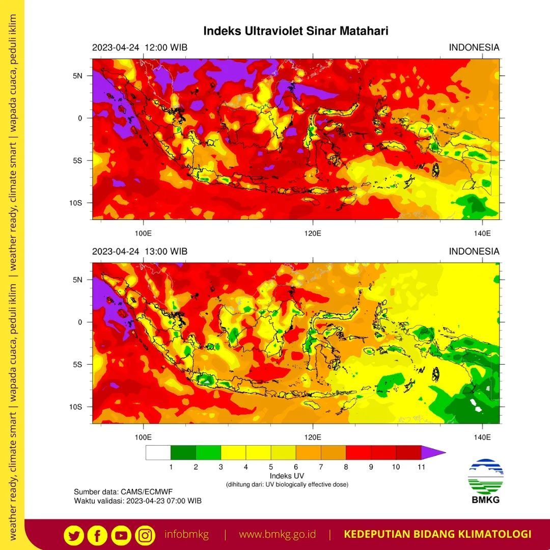 Sementara itu, untuk indeks sinar UV sangat bahaya yang ditandai dengan indikator warna merah akan memulai kawasan Papua pada pukul 08.00 WIB. Lalu menjalar hingga Sulawesi pukul 09.00 WIB.