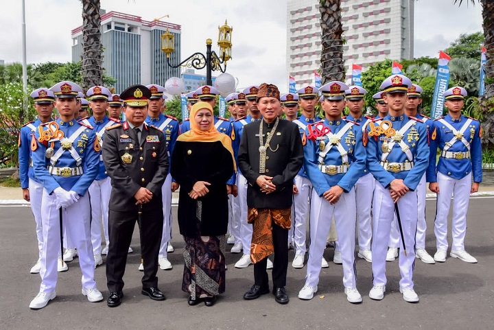 Usai upacara, Gubernur Khofifah bersama Kapolda Jatim, Sekdaprov Jatim Adhy Karyono, Kadindik Jatim Wahid Wahyudi, Kapolda Jatim Irjen Pol Toni Harmanto dan jajaran Forkopimda Jatim yang hadir meninjau Stand Pameran yang ada di halaman Grahadi Surabaya. rko