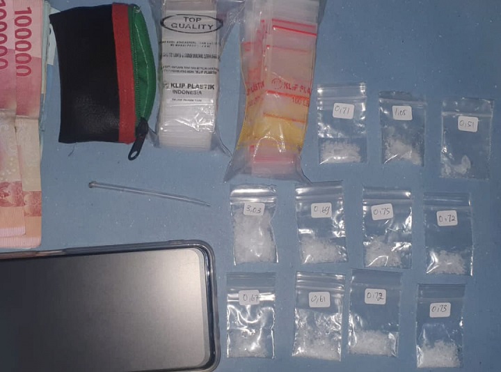 Polisi juga mengamankan barang bukti berupa dua bendel plastik klip, satu handphone Oppo, satu dompet hitam, satu skrop, dan uang hasil penjualan sabu sebesar Rp 1.400.000.