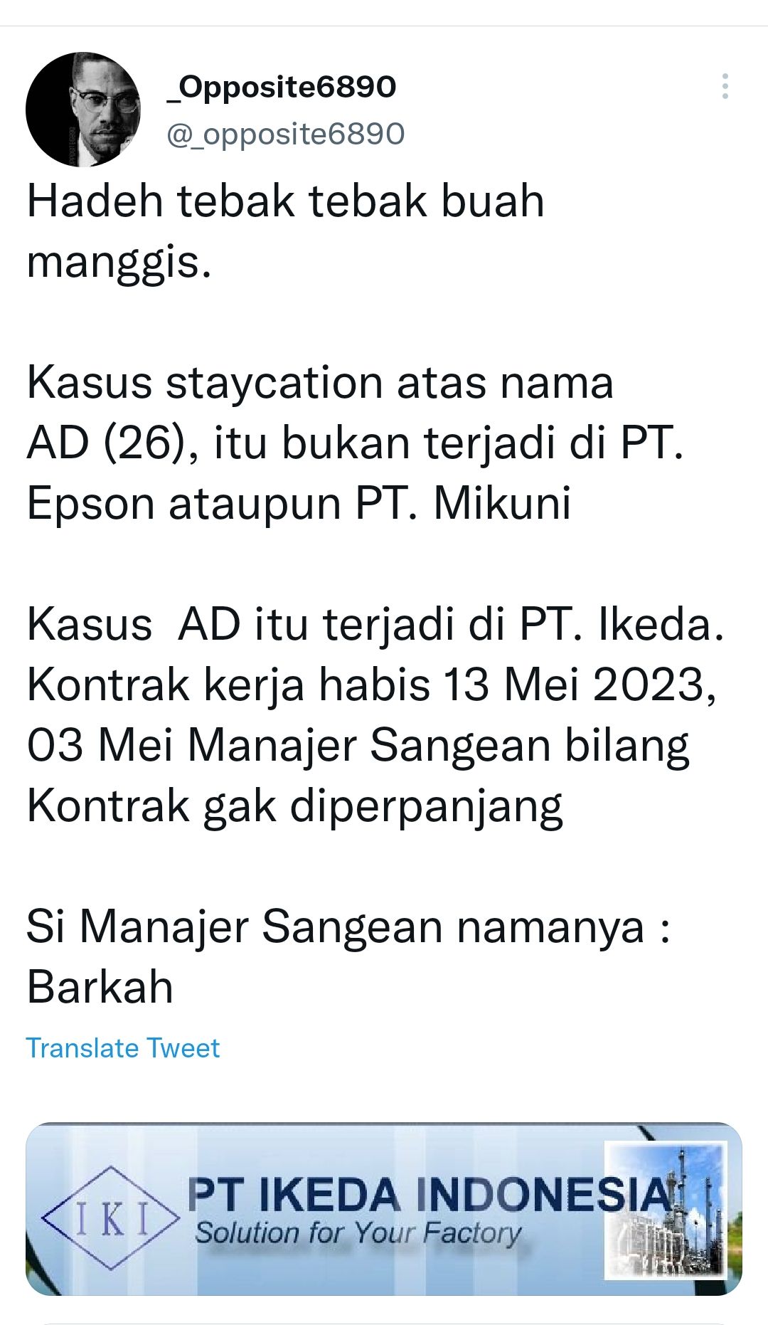 "Kasus staycation atas nama AD itu bukan terjadi di PT Epson ataupun PT Mikuni. Kasus AD itu terjadi di PT Ikeda," lanjutnya. Ia juga menyebut bahwa kontrak AD akan habis pada 13 Mei 2023, Ia lalu dihubungi oleh manajer agar memperpanjang kontrak dengan syarat mau diajak bertemu.