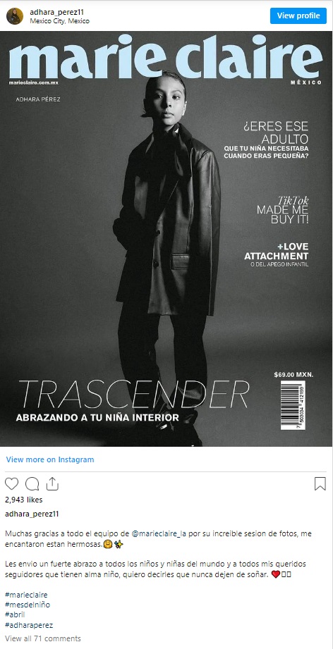 Diketahui, kini Adhara tampil jadi model sampul majalah Marie Claire Meksiko. Dalam kesempatan itu keluarga menceritakan suka duka gadis tersebut menjadi anak yang pintar.