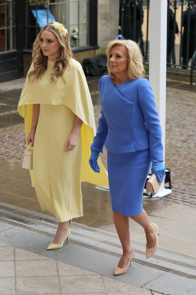 Jill Biden datang bersama dengan sang cucu, Finnegan Biden. Kontras dengan sang nenek, Finnegan mengenakan cape dress berwarna kuning terang. Ia berjalan di samping Jill, mengenakan headband berbentuk bunga berwarna kuning, dan menenteng handbag berwarna krem.
