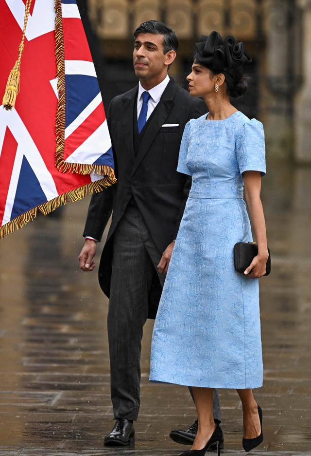 Gaya Akshata Murthy, istri Perdana Menteri Inggris Rishi Sunak, juga mencuri perhatian. Ia tampil mendampingi sang suami dalam balutan dress setinggi betis berwarna biru muda. Ia memaksimalkan penampilannya dengan statement earrings.