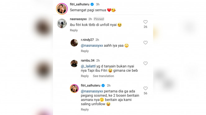 “Pertama dia ga ada pegang sosmed, kedua bosen beritain asmaranya, beritain aja kami saling unfollow,” jawab Fitri Salhuteru di kolom komentar.