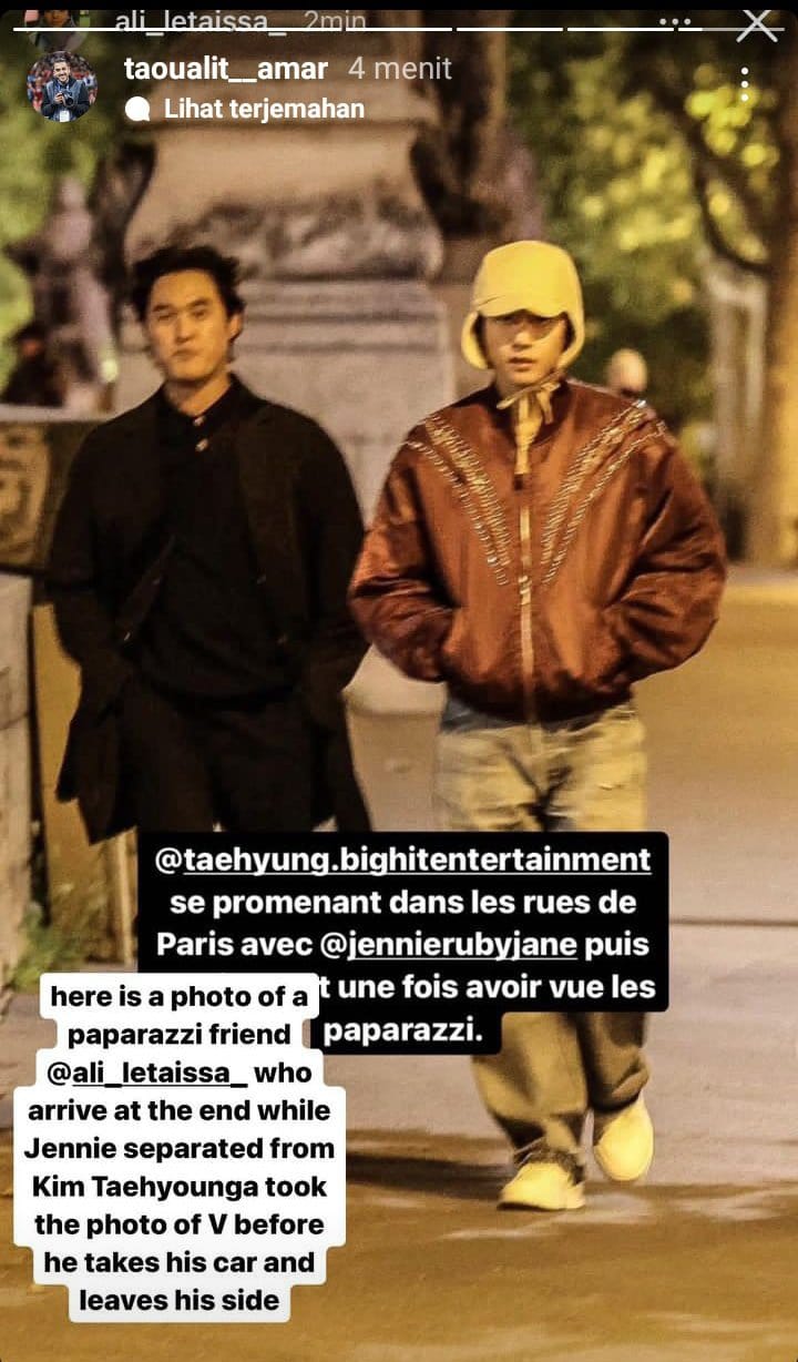 Dugaan tersebut pun dijawab melalui video yang direkam oleh seorang fotografer asal Paris, Amar Taoualit, yang menunjukkan sepasang orang yang diduga Jennie dan V tengah berjalan beriringan di jalanan Paris.