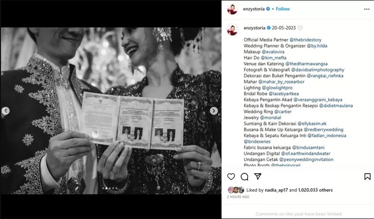 Momen pernikahan tersebut terlihat dalam Instagram pribadi milik Enzy Storia. "20-05-2023," tulis Enzy Storia dalam Instagram miliknya, dikutip Minggu (21/05/2023).