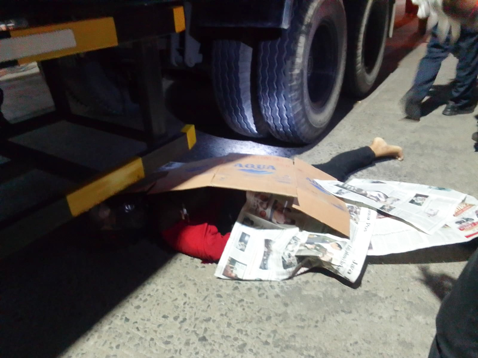 Diketahui, korban memakai kaos lengan panjang warna merah dengan memakai celana panjang hitam dalam keadaan tengkurap akibat terlindas ban belakang truk trailer.