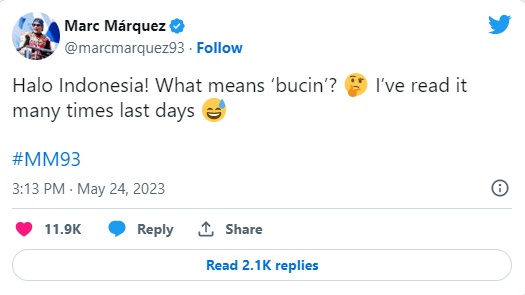 Marc Marquez yang penasaran dengan arti kata 'Bucin' itu lantas bertanya ke netizen di Indonesia. "Halo Indonesia, apa arti kata 'bucin'? Beberapa hari ini saya sering membacanya," cuit akun twitter miliknya, marcmarquez93, dikutip Kamis (25/05/2023).