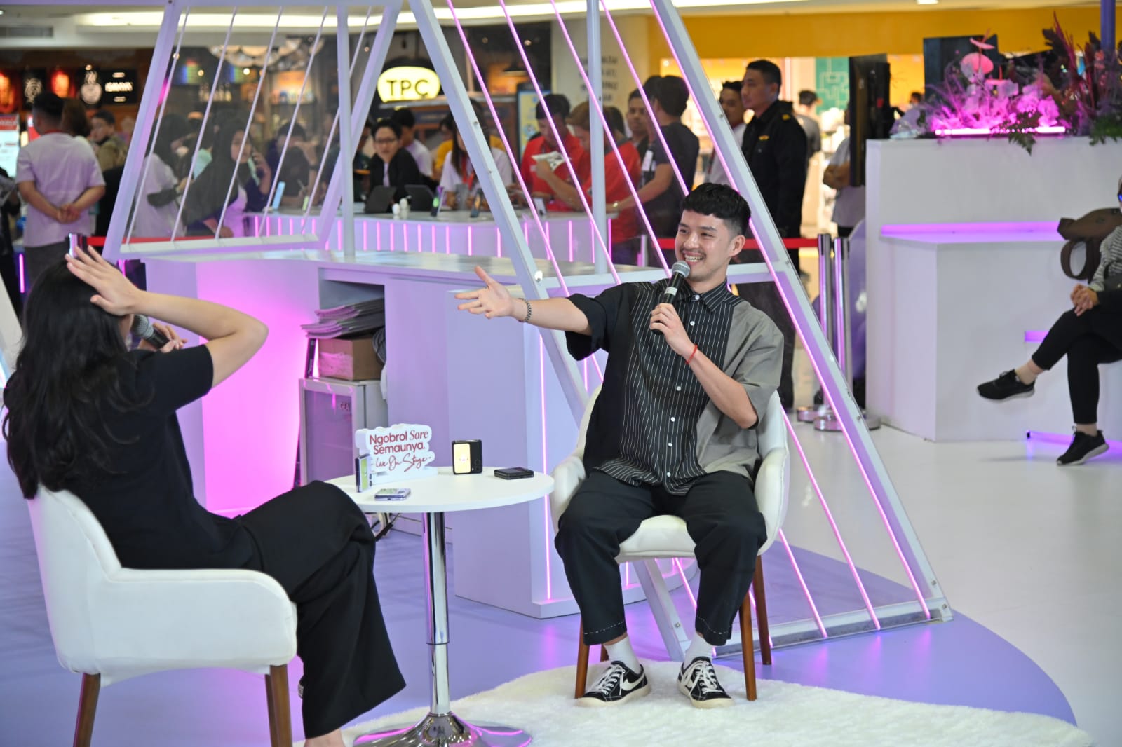 SurabayaPagi, Surabaya - Mantan anggota boy band Smash, Morgan Oey hadir menyapa ratusan fansnya dalam acara Ngobrol Santai Semaunya di Pop Up store Oppo Tunjungan Plaza, Surabaya, Kamis (26/5/2023).